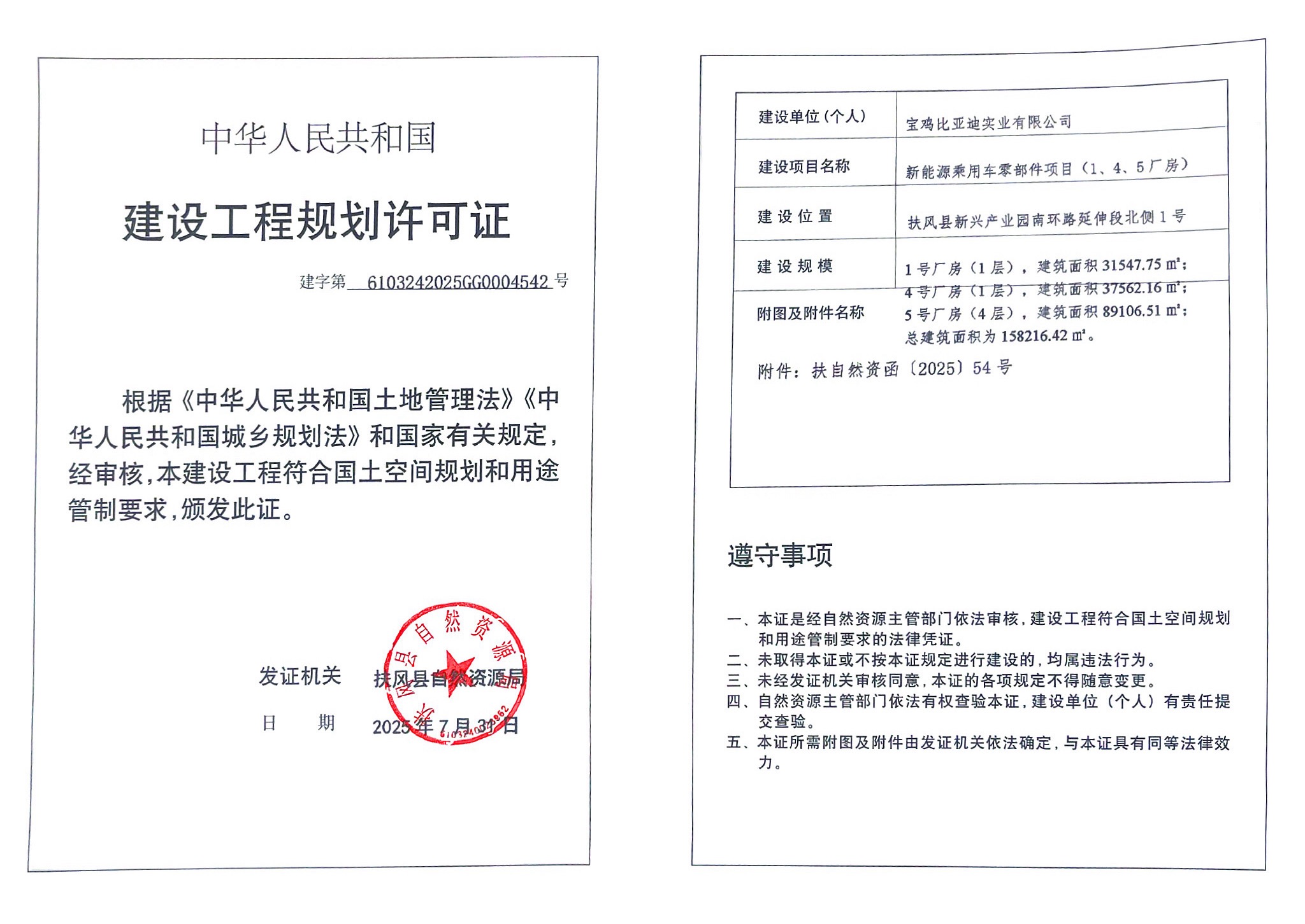 宝鸡比亚迪实业有限公司拟建设的新能源乘用车零部件项目位于扶风新兴产业园南环路延伸段北侧,东大街延伸段南侧,法汤高速东侧。首期建设用地面积为530232.883平方米(约795.349亩),规划总建筑面积666807.86㎡,其中1、4、5号厂房建筑面积为158216.42㎡。