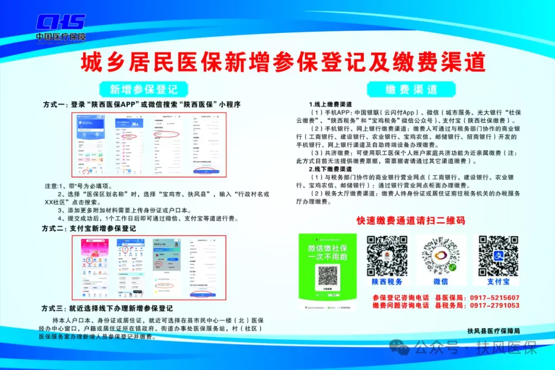 根据国家税务总局宝鸡市税务局、宝鸡市医疗保障局《关于宝鸡市2025年城乡居民基本医疗保险参保缴费的通告》(2025年第2号),宝鸡市2025年城乡居民医保参保缴费现已正式开始,广大城乡居民可以根据自身实际,任意选择以下渠道进行参保缴费: