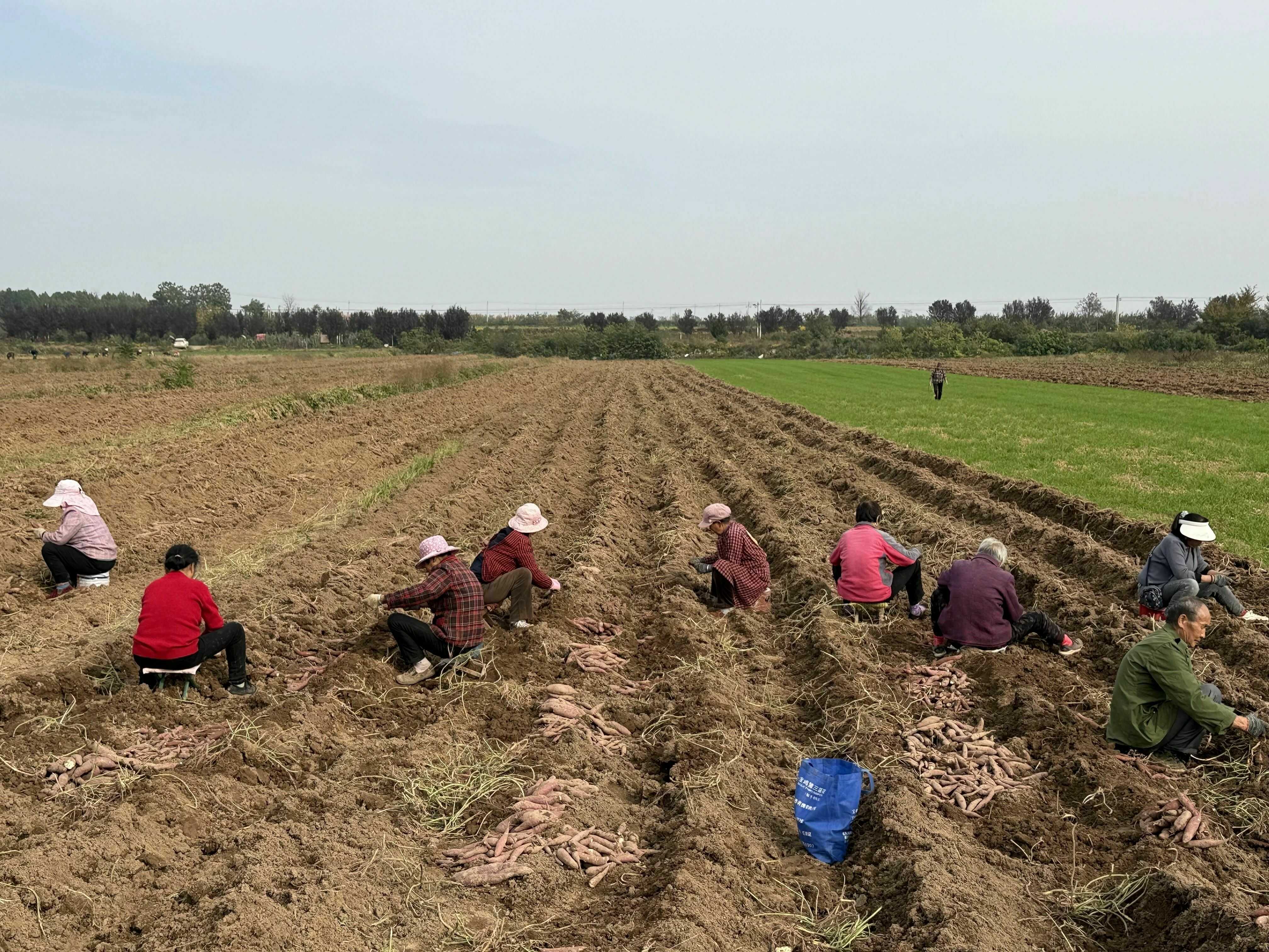 正在捡拾红薯的杜城村村民王春珠抹了把汗,手里的动作却不停。基地里,两台甘薯收获机每小时可完成 3 亩采收,取代了传统人工刨挖,村民们只需分拣装袋,效率比以往提高10倍以上。