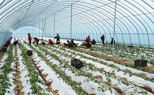 走进育苗大棚,温暖湿润的气息扑面而来,工人们熟练地进行栽苗、覆土、覆膜等工序,一派“人勤春来早”的繁忙景象(见右图)。“我们基地创新采用脱毒试管苗‘以苗繁苗’模式——先在实验室培育出不带病毒的健康母苗,再将这些母苗移栽在大棚内,大量繁殖高产薯苗。”权博一介绍,脱毒苗具有长势强、无病毒、繁殖快等优点,比普通薯苗成活率提高20%左右,亩均产量高出30%以上,因此成为市场上的“香饽饽”。同时,为最大化提升效益,他们还探索出“一棚三收”高效轮作模式:早春育脱毒苗,夏季种商品红薯,秋季轮作西葫芦等蔬菜,实现“红薯苗—红薯—蔬菜”全年不间断生产。这一模式不仅有效提高了土地利用率,还让大棚四季不闲、收益翻番。
