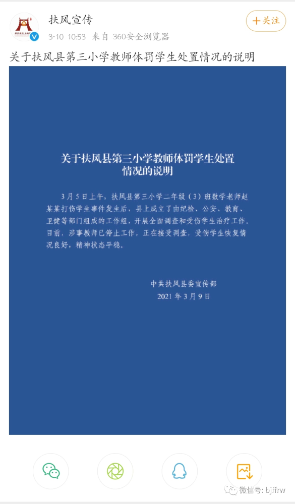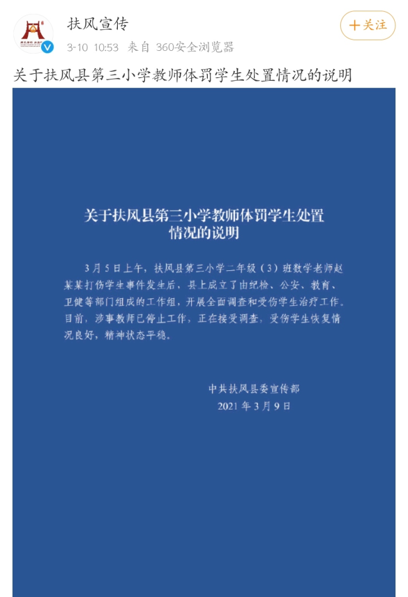 关于扶风县第三小学教师体罚学生处置情况的说明